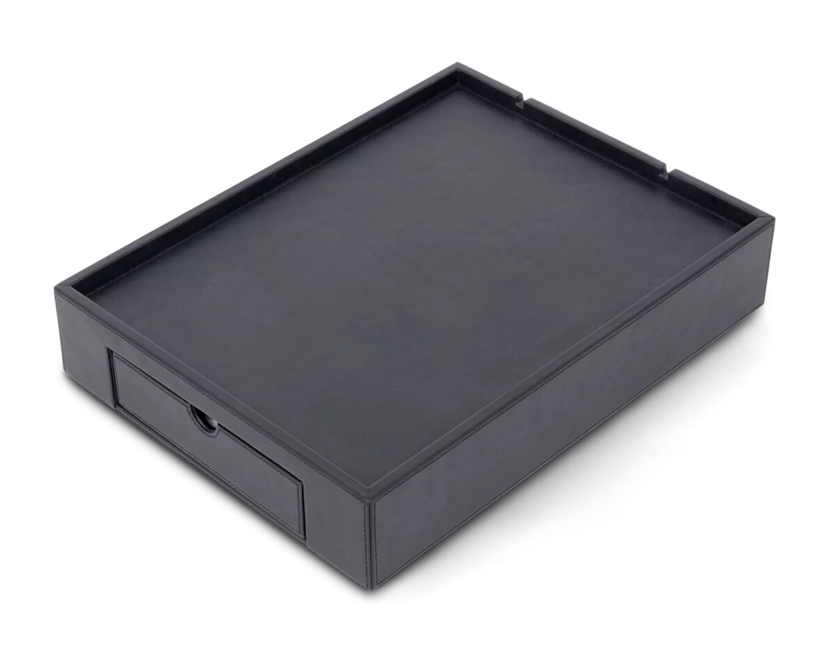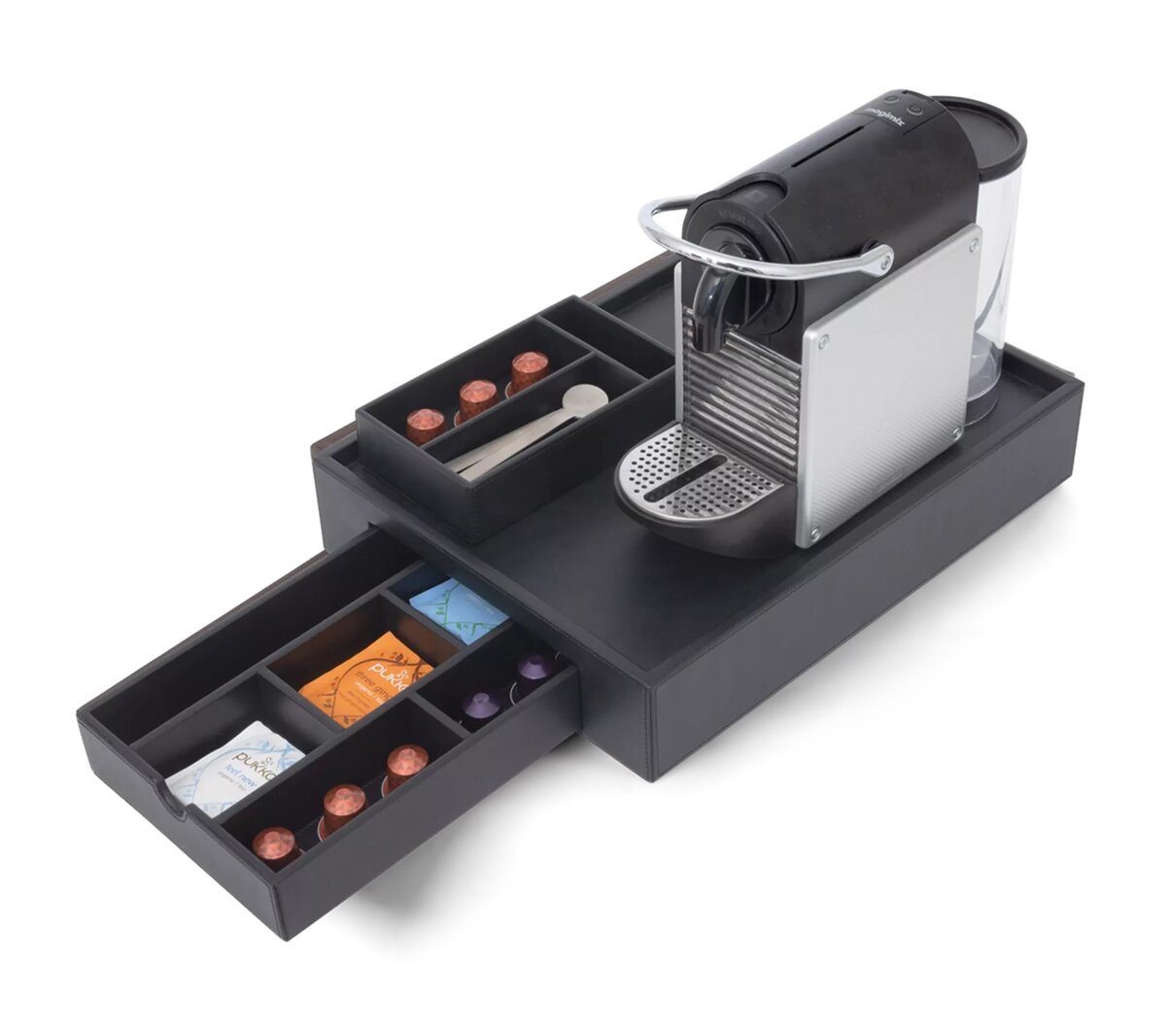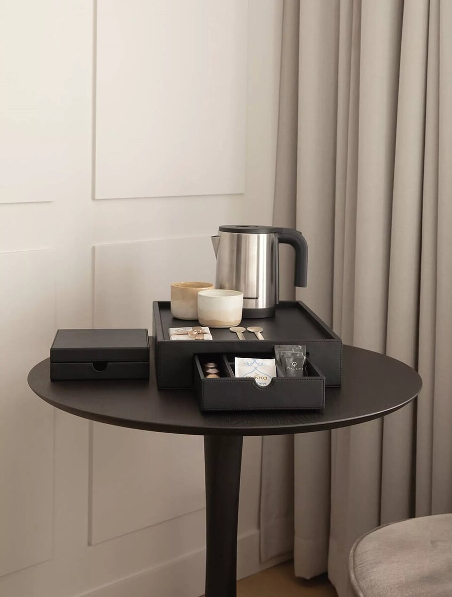 Елегантний водовідштовхувальний піднос Stromboli з вбудованою шухлядою та отворами для кабелів забезпечує ідеальний порядок у кавовій зоні готельного номера. Це стильне та зносостійке рішення для зручного зберігання капсул і аксесуарів, що підкреслить преміальний сервіс вашого закладу.